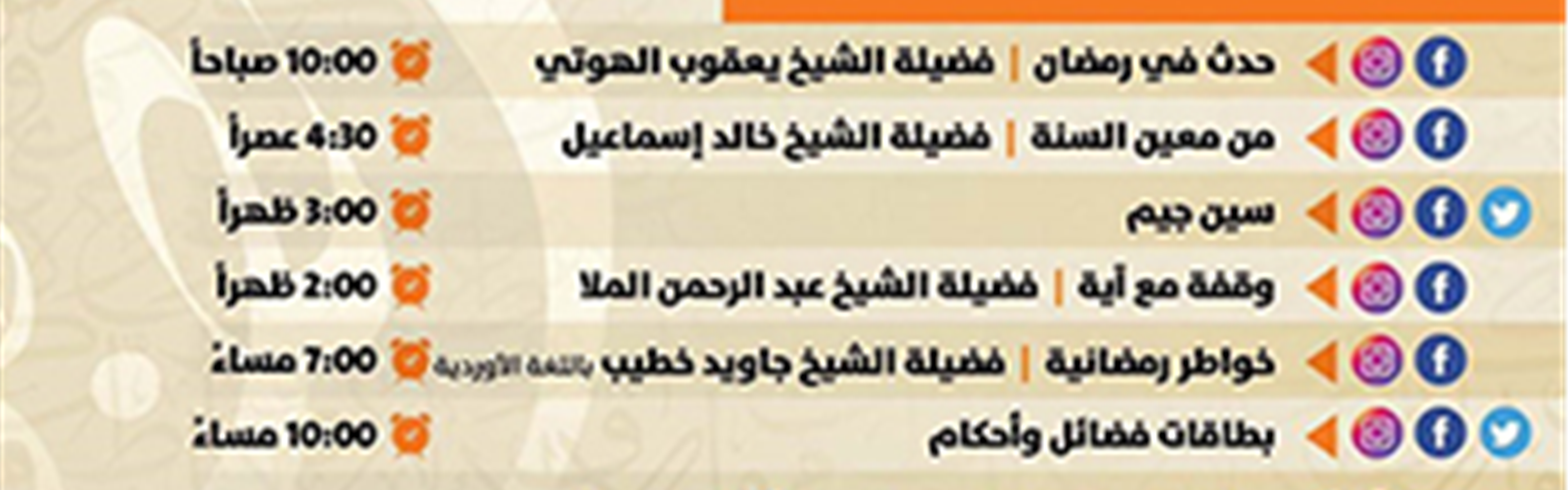 يسرنا دعوتكم لحضور برنامج فتاوى الذي يجيب عن جميع استفساراتكم بالمسائل الشرعية الخاصة بالشهر الفضيل مع نخبة من الشيوخ الأفاضل عبر قنوات التواصل الاجتماعي وبرنامج الزووم، أيام الأحد والأربعاء من الساعة 01.00 ظهراً إلى 10:00 مساءً.