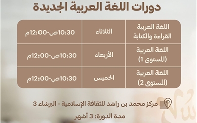 أعلنت دائرة الشؤون الإسلامية والعمل الخيري بدبي عن إطلاق دورات تعليم اللغة العربية للعام 2025، وذلك بمركز محمد بن راشد للثقافة الإسلامية، حيث تهدف هذه الدورات إلى تمكين المشاركات من تطوير مهارات القراءة والكتابة باللغة العربية، وتعزيز التفاعل الثقافي الذي يعكس قيم اللغة العربية ومكانتها.