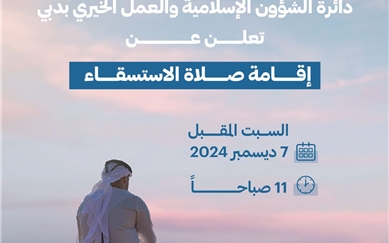 أعلنت دائرة الشؤون الإسلامية والعمل الخيري بدبي عن إقامة صلاة الاستسقاء في جميع مساجد الإمارة يوم السبت المقبل، الموافق 7 ديسمبر الجاري، في تمام الساعة 11 صباحاً تأتي هذه الصلاة تأسياً بهدي النبي محمد صلى الله عليه وسلم في طلب نزول الغيث.