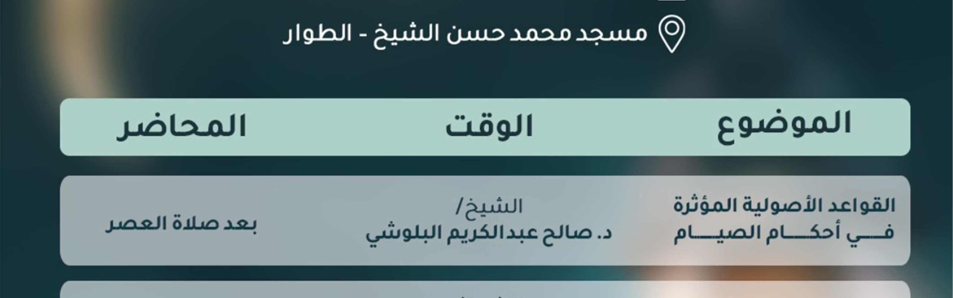The Department of Education and Religious Guidance at the Department of Islamic Affairs and Charitable Activities in Dubai is organizing a set of religious lessons on the jurisprudence of fasting and zakat, at the Muhammad Hassan Al-Sheikh Mosque in the Al-Twar area from March 17 to 19 of this month, after the Asr, Maghrib and Isha prayers, and deals with various topics, including an explanation of fundamental rules Influencing the provisions of fasting, delivered by Sheikh d. Salih Abd al-Karim al-Balooshi, and explaining the book Fasting in Umdat al-Ahkam, by Sheikh d. Abdullah Abdul-Qader Al-Kamali, and explaining the book “Al-Zakah” in “Umdat Al-Ahkam” by Sheikh Dr. Aziz bin Farhan Al-Anzi.