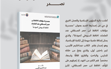 The Islamic Affairs and Charitable Activities Department in Dubai has announced the release of its new book titled "The Source of the Works of Al-Hafiz Ibn Hajar Al-Asqalani According to Scholars: Al-Hafiz Al-Suyuti as a Model". This work represents an important scholarly addition to the Islamic library, authored by Abdul Hakim Al-Anis, Senior Researcher. The book opens broad horizons for students, researchers, and readers, summarizing much of the effort by introducing them to the author, Al-Hafiz Ibn Hajar Al-Asqalani, one of the most prominent and prolific scholars of his time.