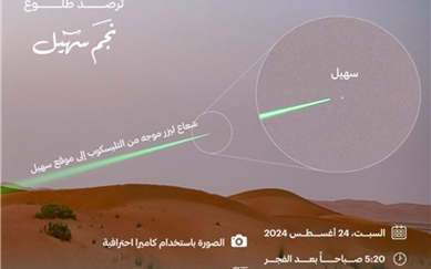 أعلنت دائرة الشؤون الإسلامية والعمل الخيري بدبي عن نجاحها في رصد طلوع نجم سهيل ورؤيته فجراً وبشكل واضح من مدينة العين منطقة القوع جنوب دولة الإمارات، وذلك في إطار الجهود الفلكية التي تبذلها الدائرة لمتابعة الظواهر الفلكية المجتمعية المتعلقة بإعداد التقويم الهجري السنوي.