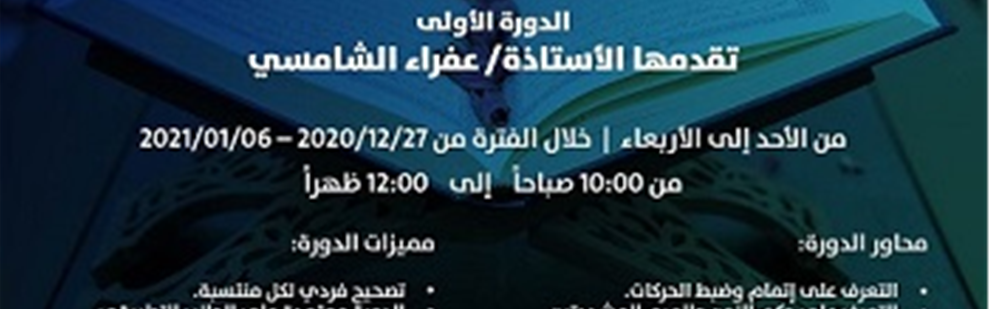 The Islamic Affairs and Charitable Activities Department in Dubai represented by the Department of Islamic Knowledge Programs, announced the organization of an online course "Correcting the Recitation of Juzu Amma” for University Students by Afra Al Shamsi. It started from 12/27/2020 - 06/01/2021, Sunday to Wednesday, from 10:00 am to 12:00 pm.